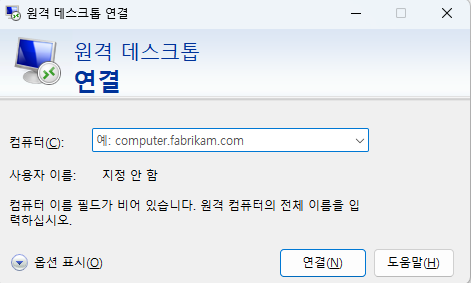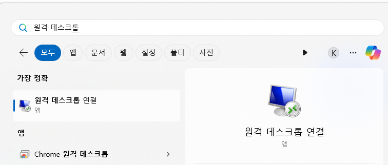 - 원격 데스크톱 연결 앱 실행: 클라이언트 PC의 검색창에 "원격 데스크톱 연결" 을 입력하고 앱을 실행합니다! Remote Desktop Connection! 🖱️