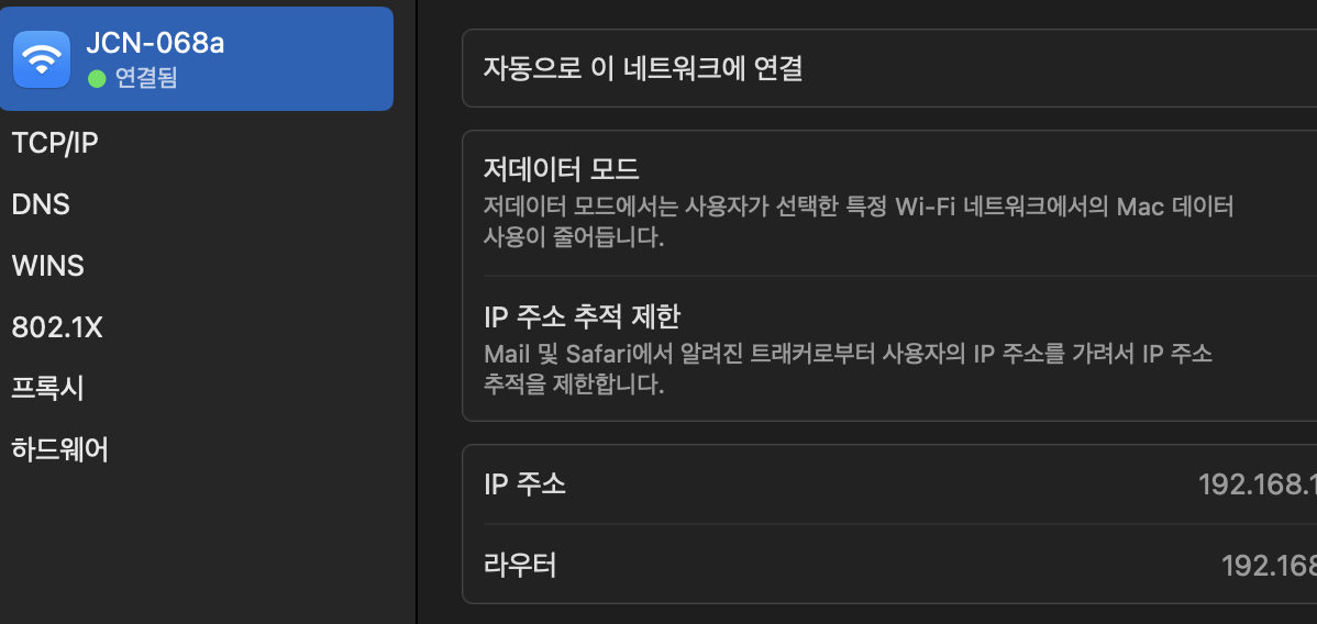 ㅁ 네트워크를 클릭하고 오른쪽 연결된 WIFI 의 세부사항을 클릭
