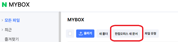 먼저 네이버 MYBOX에 접속하면 아래와 같이 한컴오피스 새 문서를 클릭