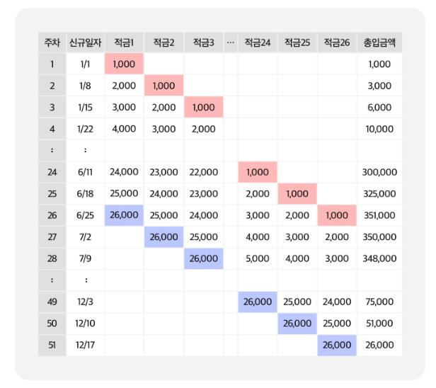 | 납입 방식 | 매주 일정 금액 자동 이체 | 매주 일정 금액 자동 이체 |