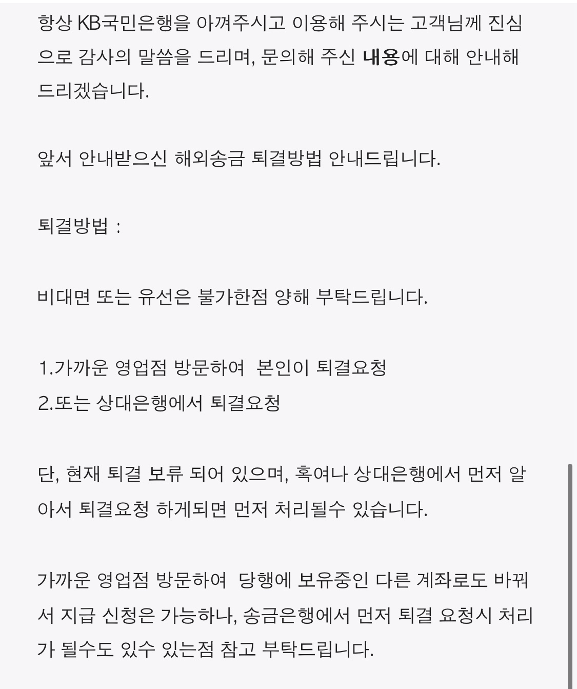 그래서 직접 KB국민은행에 직접 방문하여 처리하게 되었습니다. 그 전에 미리 송금받을 수 있는 다른 외환계좌를 만들어 KB국민은행에 방문했을 때 퇴결요청이 아닌 이 계좌로 옮겨달라고 했습니다.