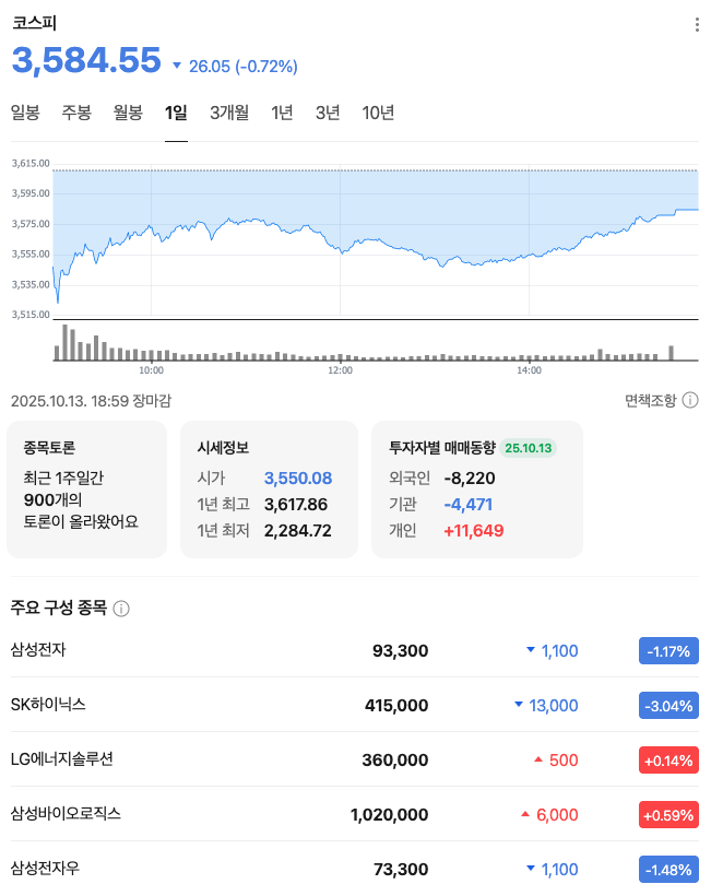 2025년 10월 13일, 코스피는 장 초반부터 강한 하락세로 출발했지만, 오후 들어서 낙폭을 일부 만회하며 마감했어.