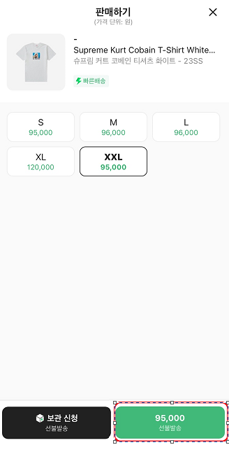 2️⃣ 판매 상품 및 사이즈 선택 후 "선불 발송" 선택!