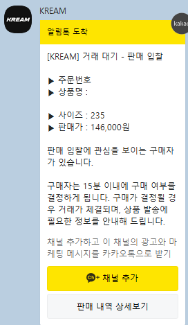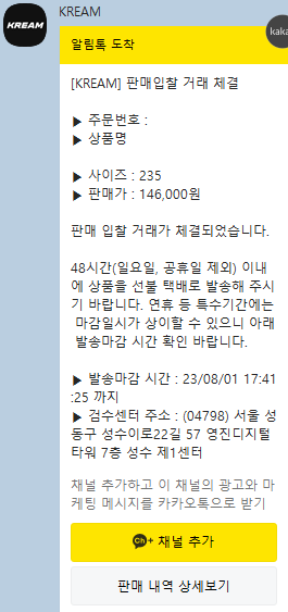 - 구매자가 구매를 결정하면, 판매 입찰 거래 체결 카카오톡 알림이 도착합니다! 🎉 드디어 거래가 성사된 거예요! 축하드립니다! 🥳