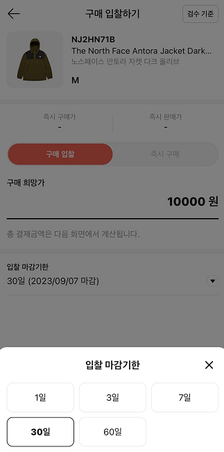 **"구매 입찰"**을 선택한 경우, 나의 입찰이 유효한 마감 기한을 설정할 수 있습니다. 원하는 기간을 선택해주세요! ⏰