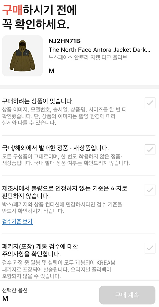 구매하고 싶은 상품 페이지에서 원하는 가격 (판매 입찰 또는 내가 원하는 구매 입찰 가격)을 확인 후 "구매" 버튼을 힘차게 눌러주세요! 💪